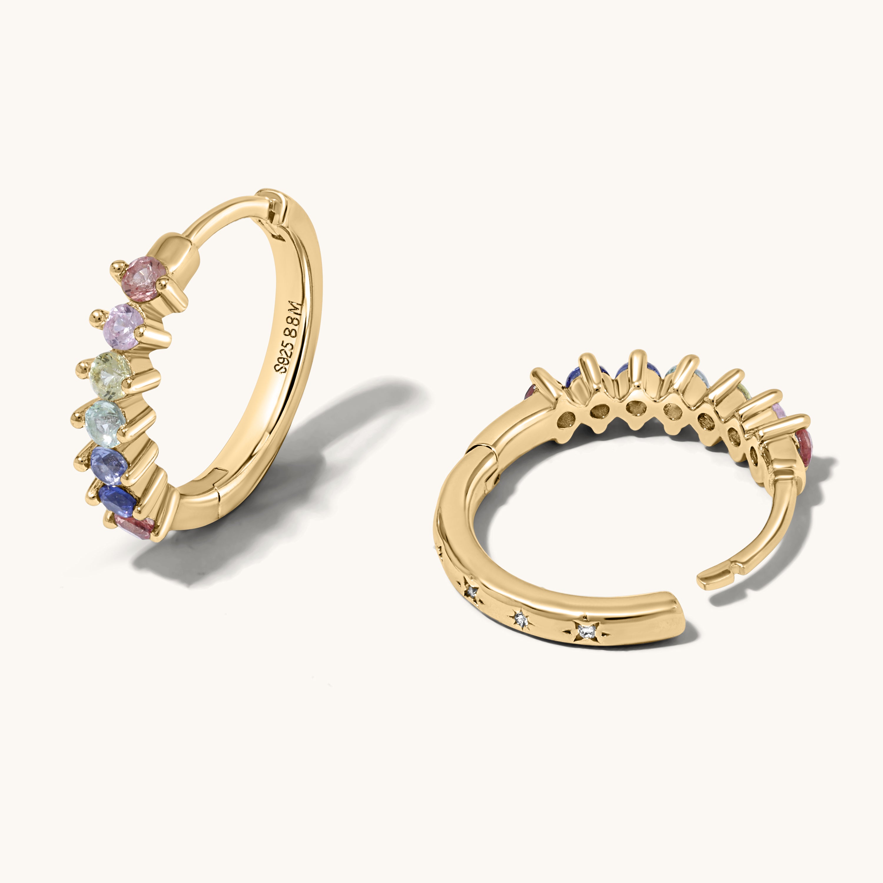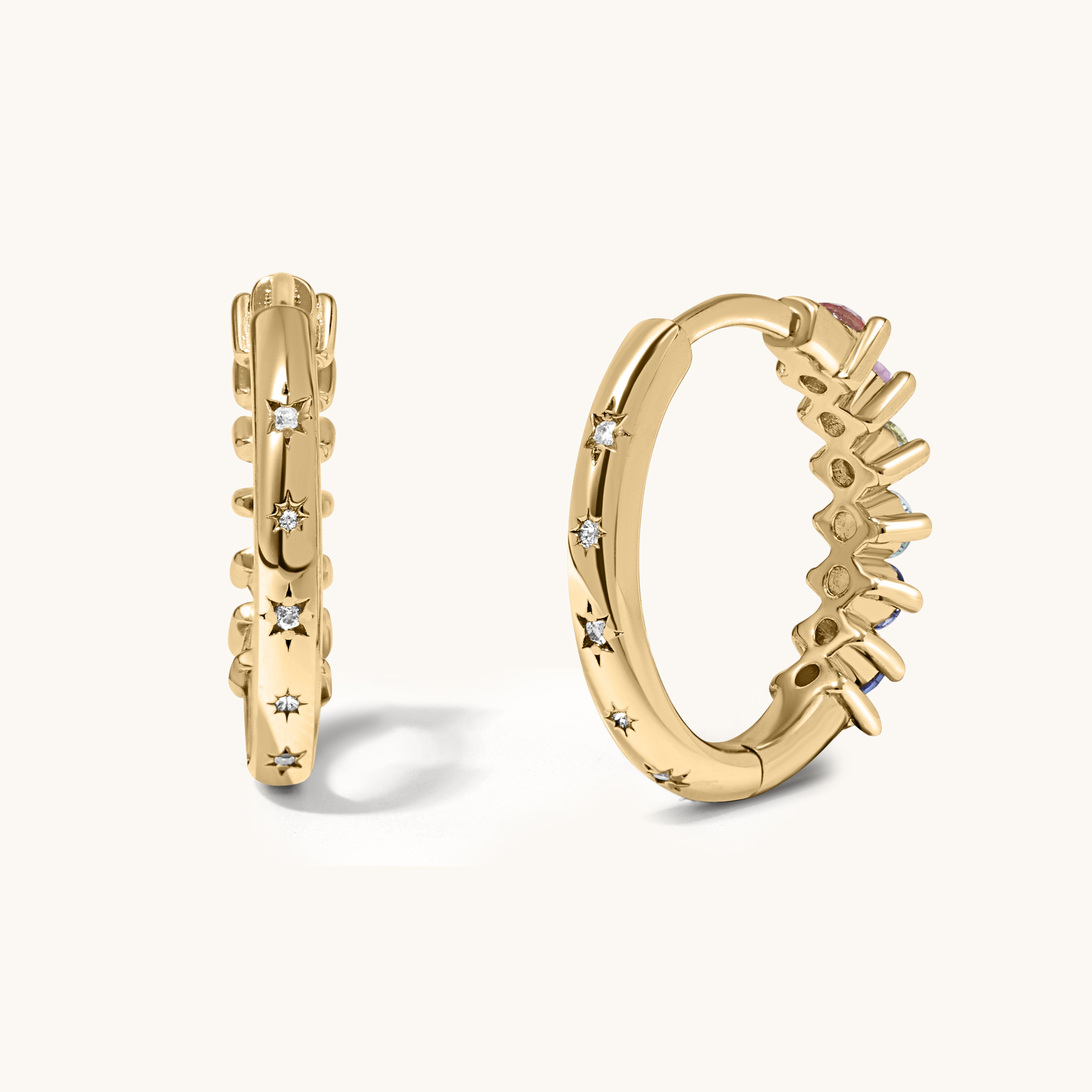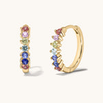 Gold hoop earrings with colorful gemstones on a light gray background