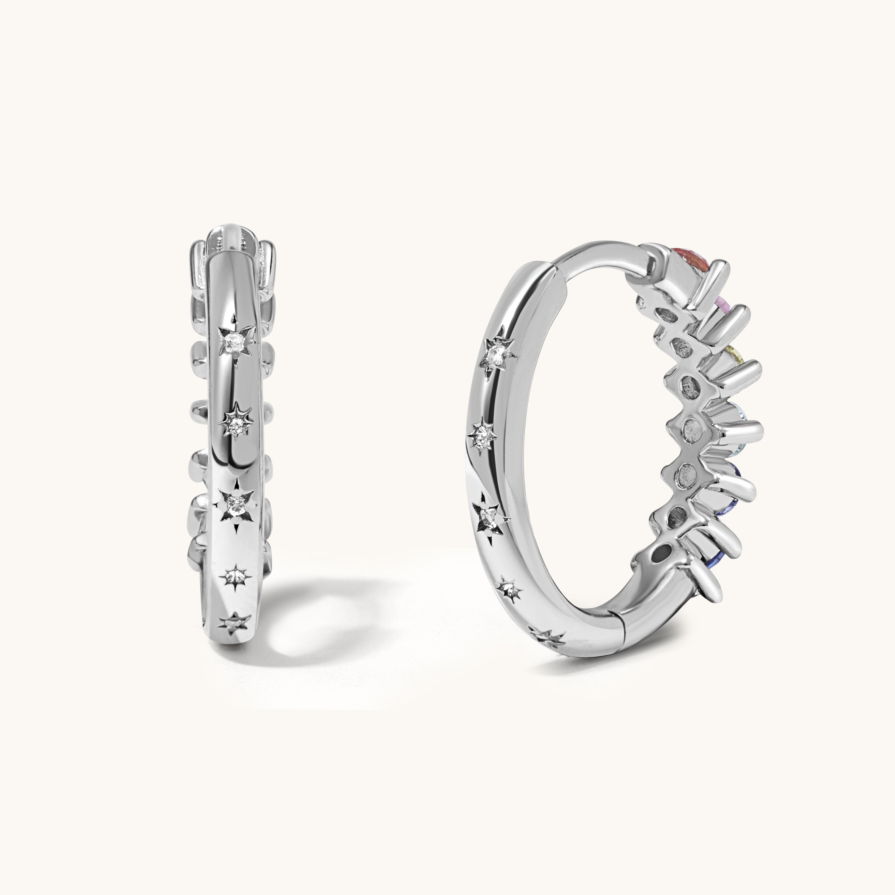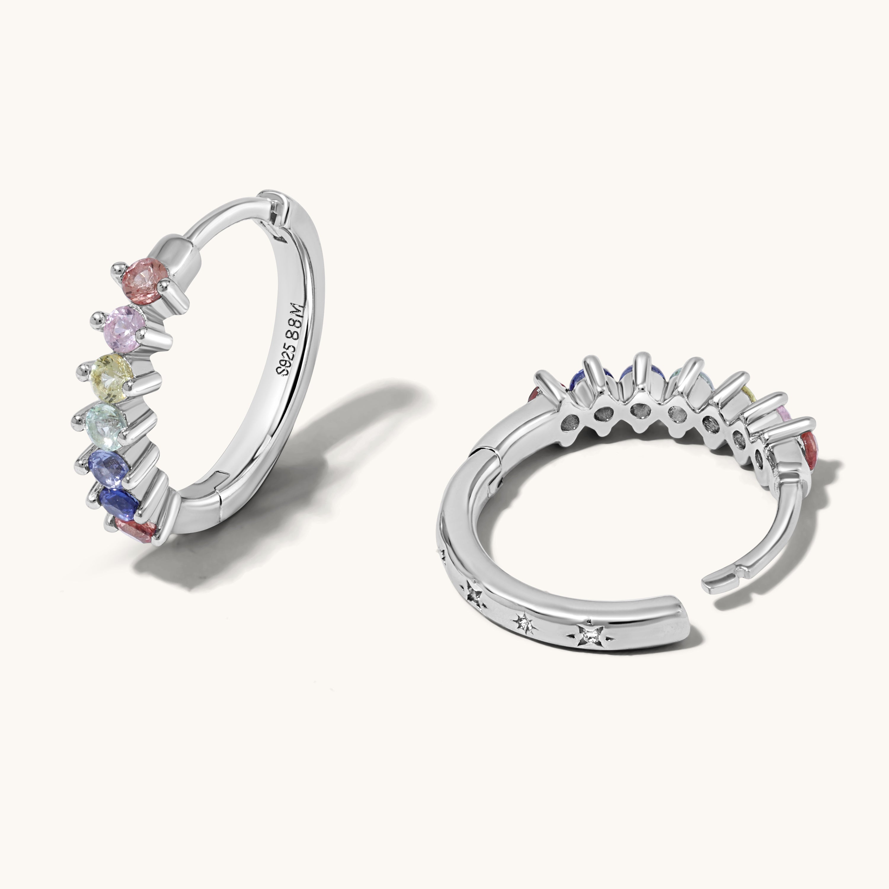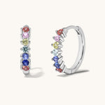 Soft rainbow chakra stones curve delicately along the ear in a refined, minimalist silhouette.