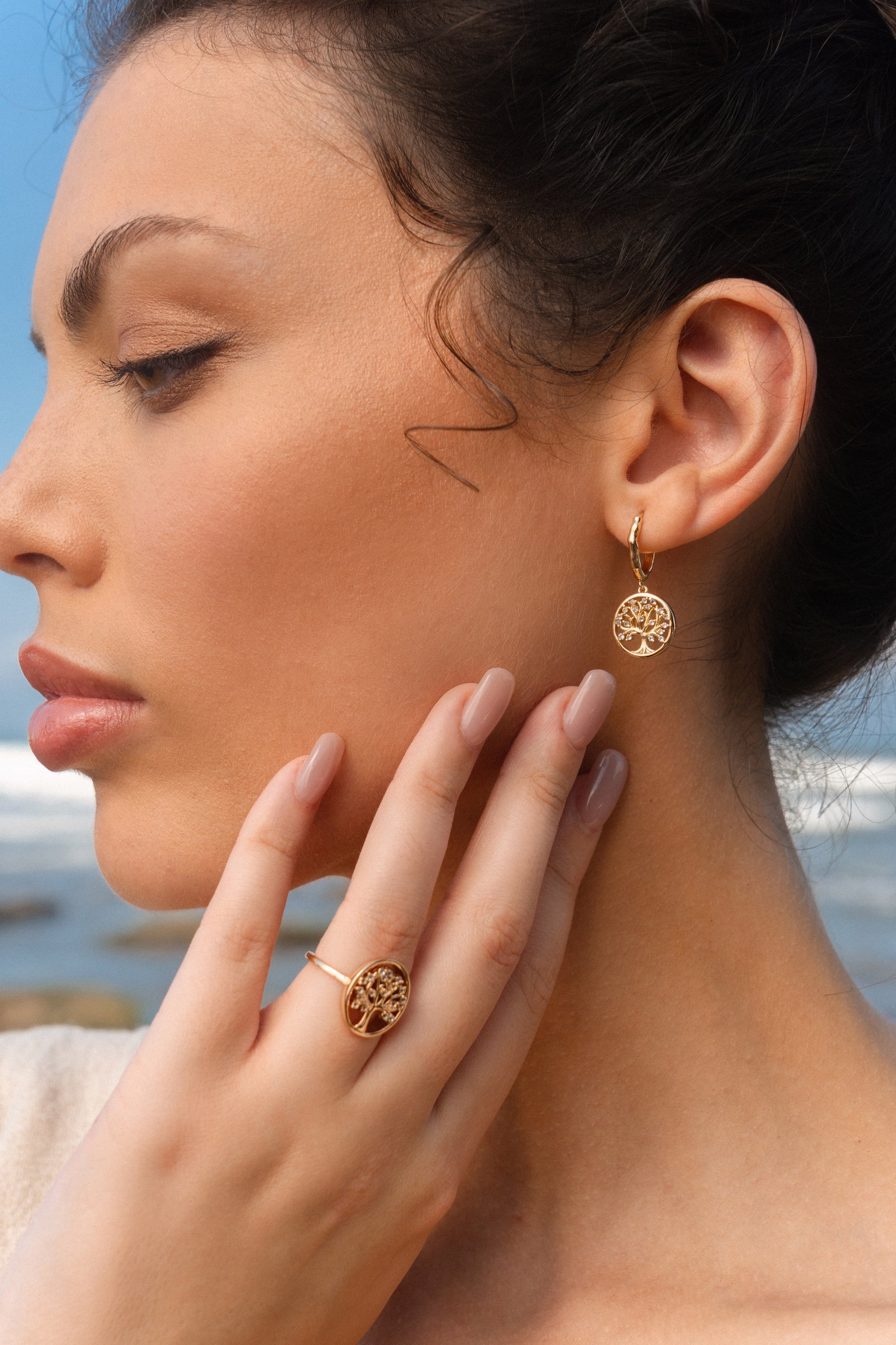 These graceful hoop earrings feature a flowing, organic edge—echoing the natural forms of tree bark and ancient roots. Adorned with sparkling white topaz stones, they embody the elegance of nature and the power of quiet connection. A refined, symbolic piece for your everyday ritual.