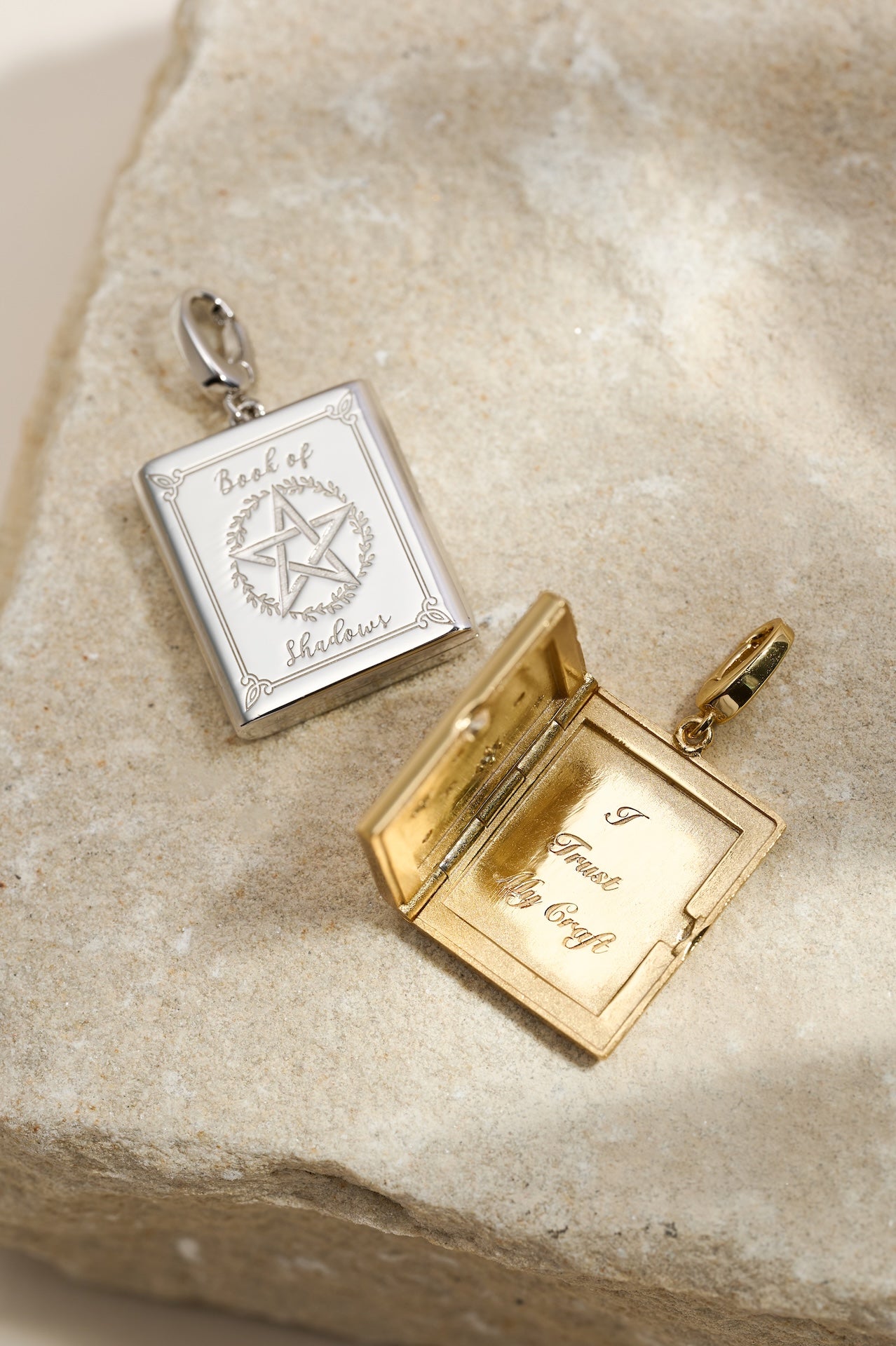 This book-inspired charm is delicately engraved with a pentacle framed in vines on the cover, a timeless symbol of protection and balance. Inside, sparkling starbursts light the pages, alongside the empowering inscription: “I Trust My Craft.”