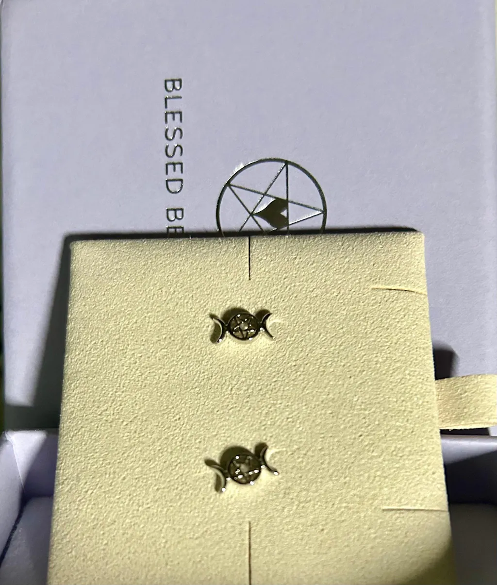 At first glance I thought that they were going to be way too small for me to wear. But after I put them on I realized that they looked fantastic and I was actually able to wear them for about a week before I noticed that I still had them in my ears. Very lightweight feeling but they look fantastic! I’m very pleased with them! The maiden, the mother, and the chrome. I have so many pieces from here and they all have stranded the test of time. These go with my mini pendant and ring from Blessed Be Magick,