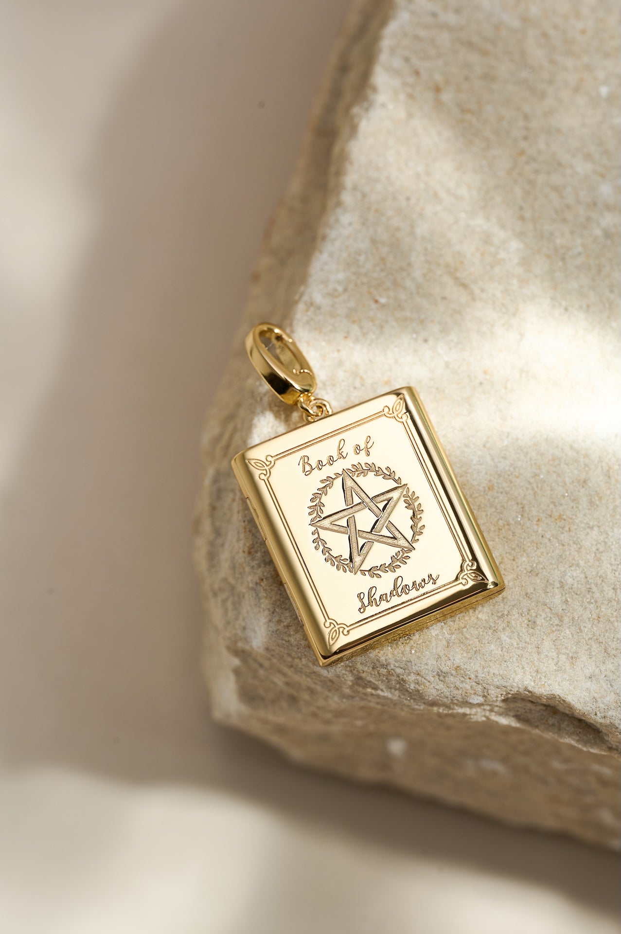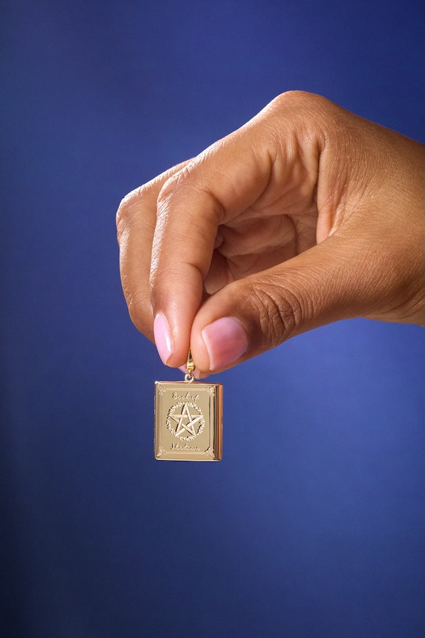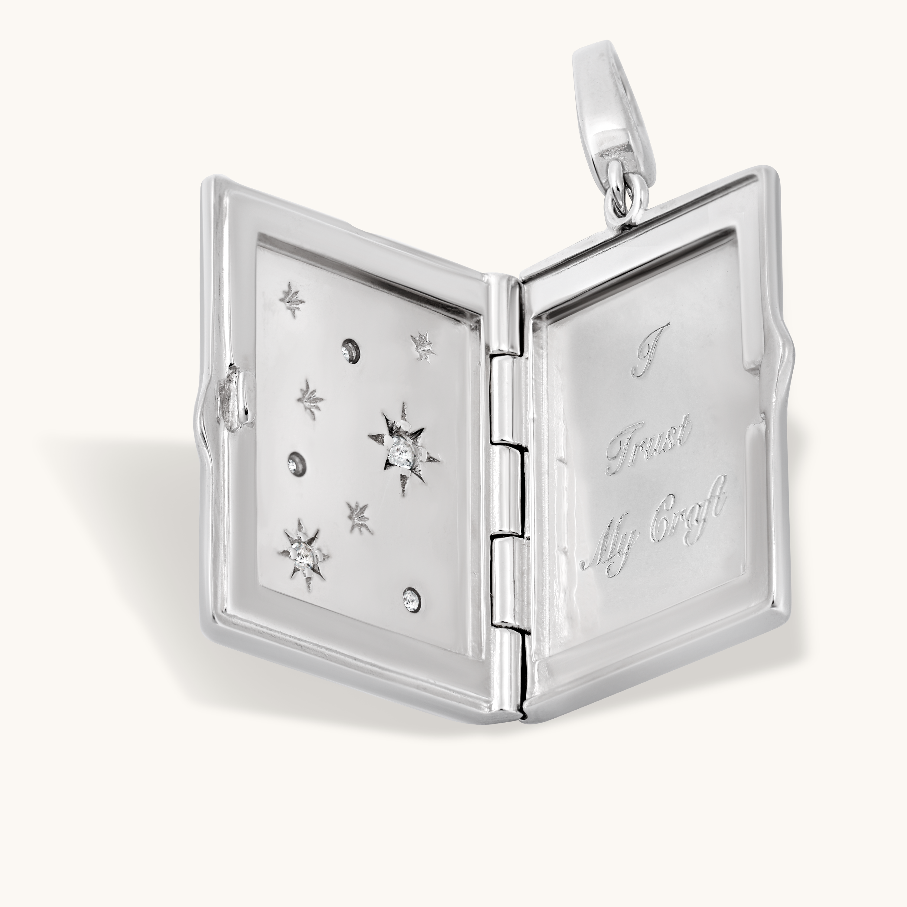 This book-inspired charm is delicately engraved with a pentacle framed in vines on the cover, a timeless symbol of protection and balance. Inside, sparkling starbursts light the pages, alongside the empowering inscription: “I Trust My Craft.”