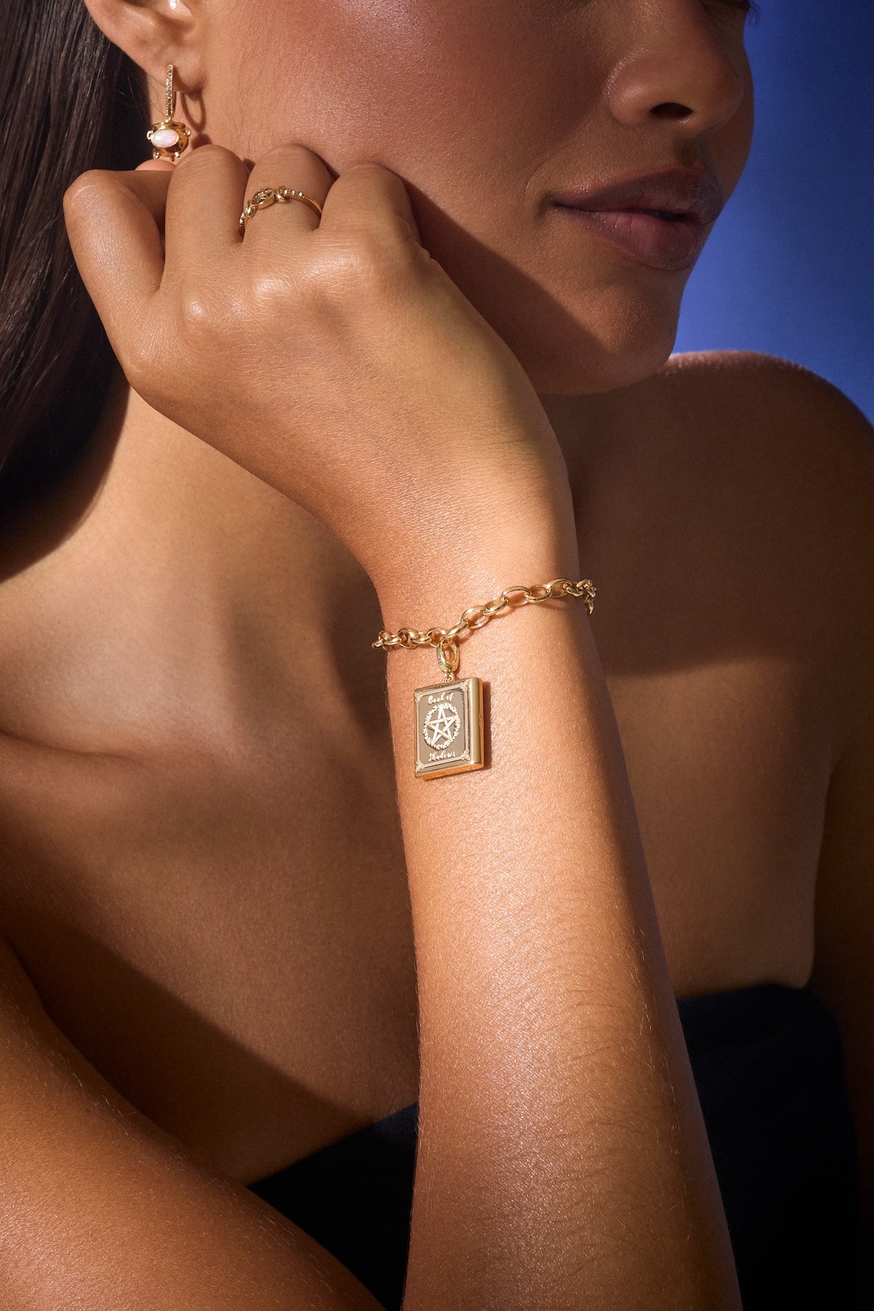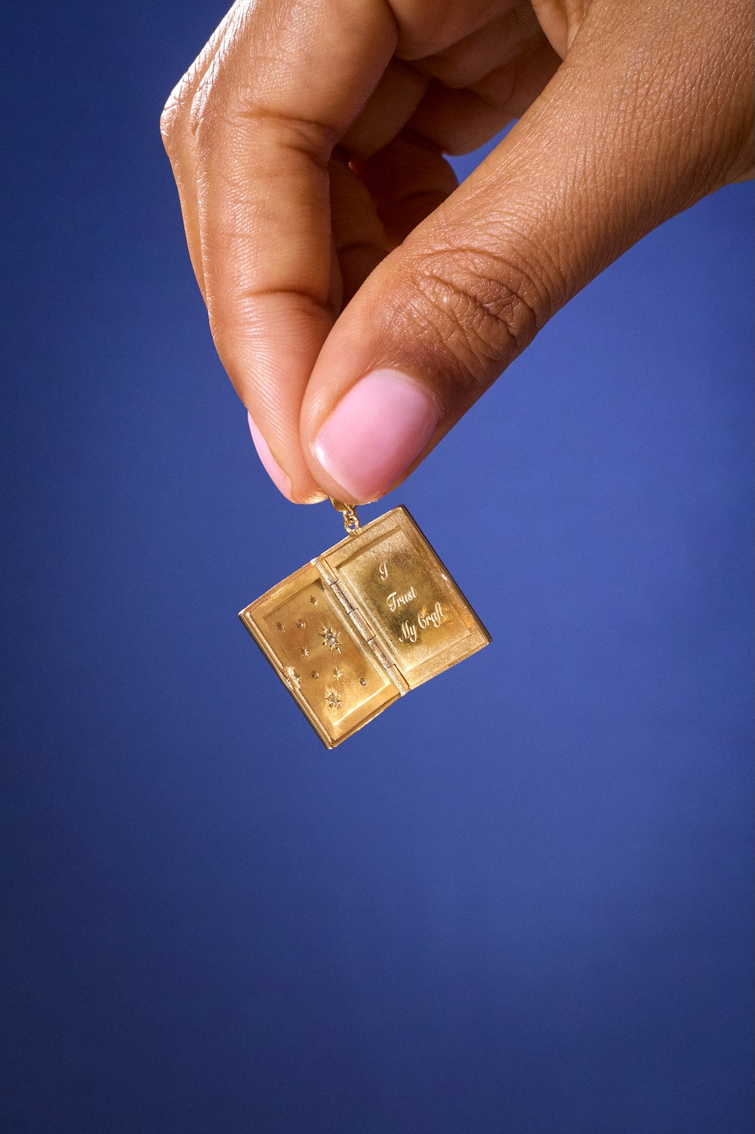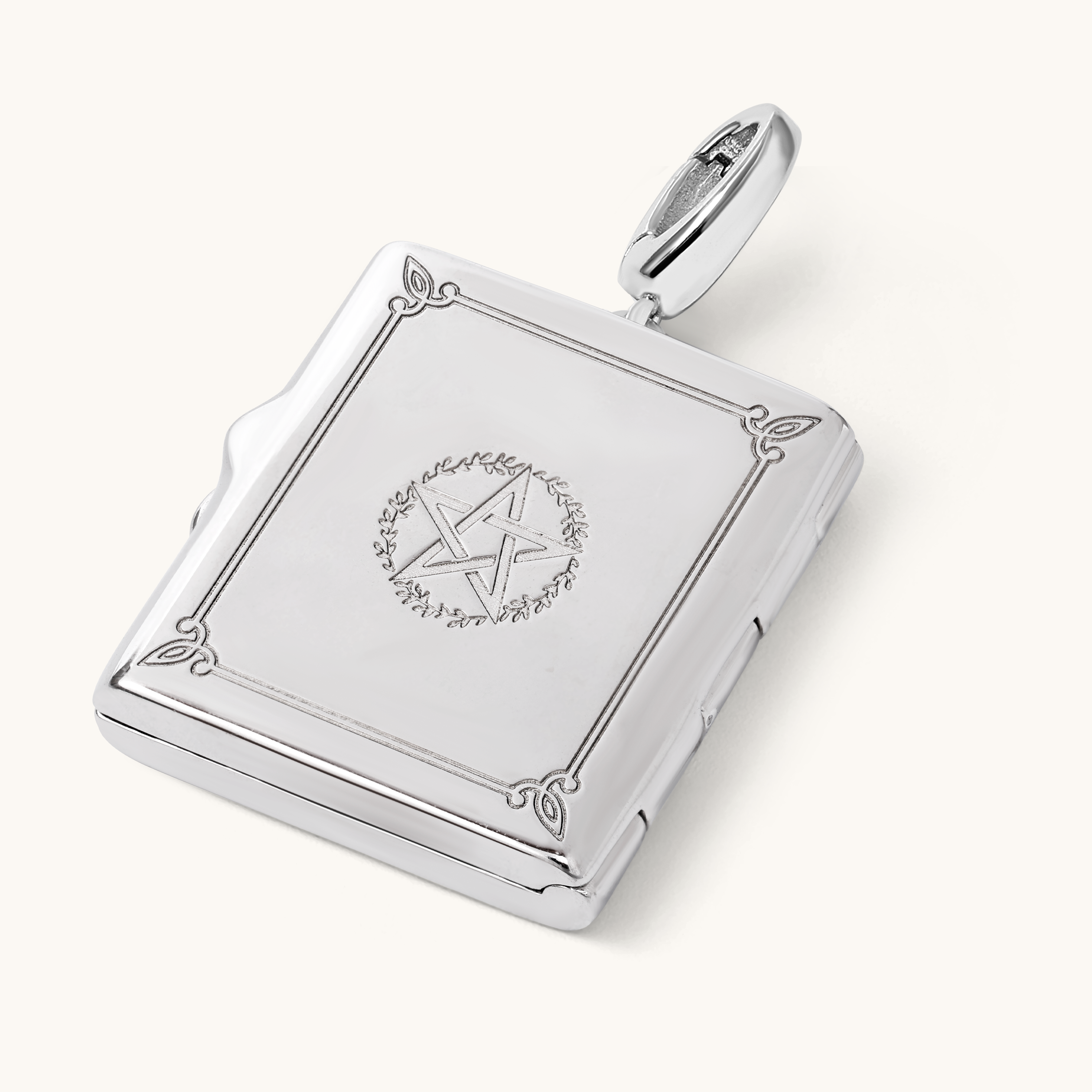 This book-inspired charm is delicately engraved with a pentacle framed in vines on the cover, a timeless symbol of protection and balance. Inside, sparkling starbursts light the pages, alongside the empowering inscription: “I Trust My Craft.”