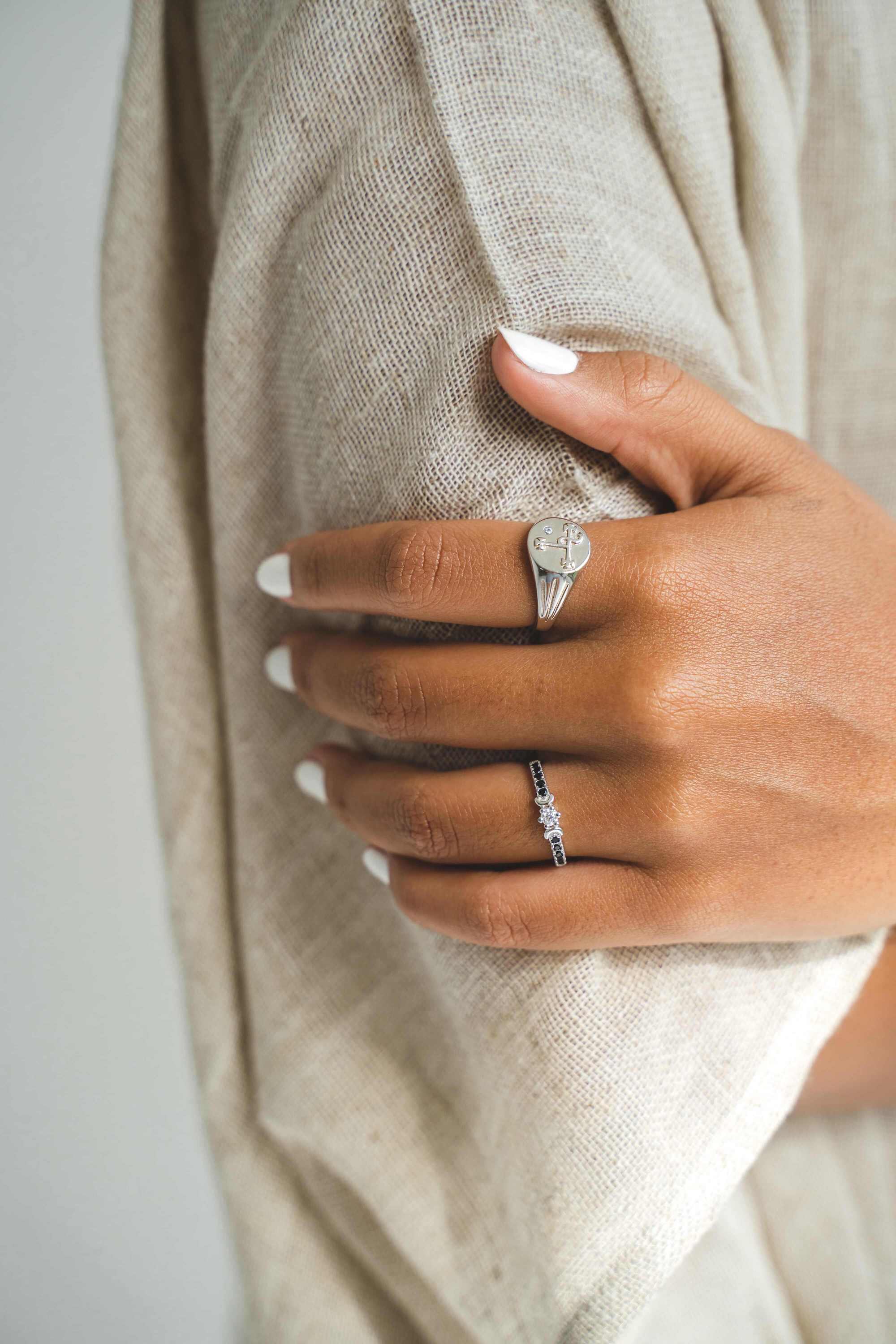 <p>Crafted in 925 Sterling Silver with small cubic zirconia stone. <p>Signet is 0.43 inches / 1.1 cm in diameter.</p>