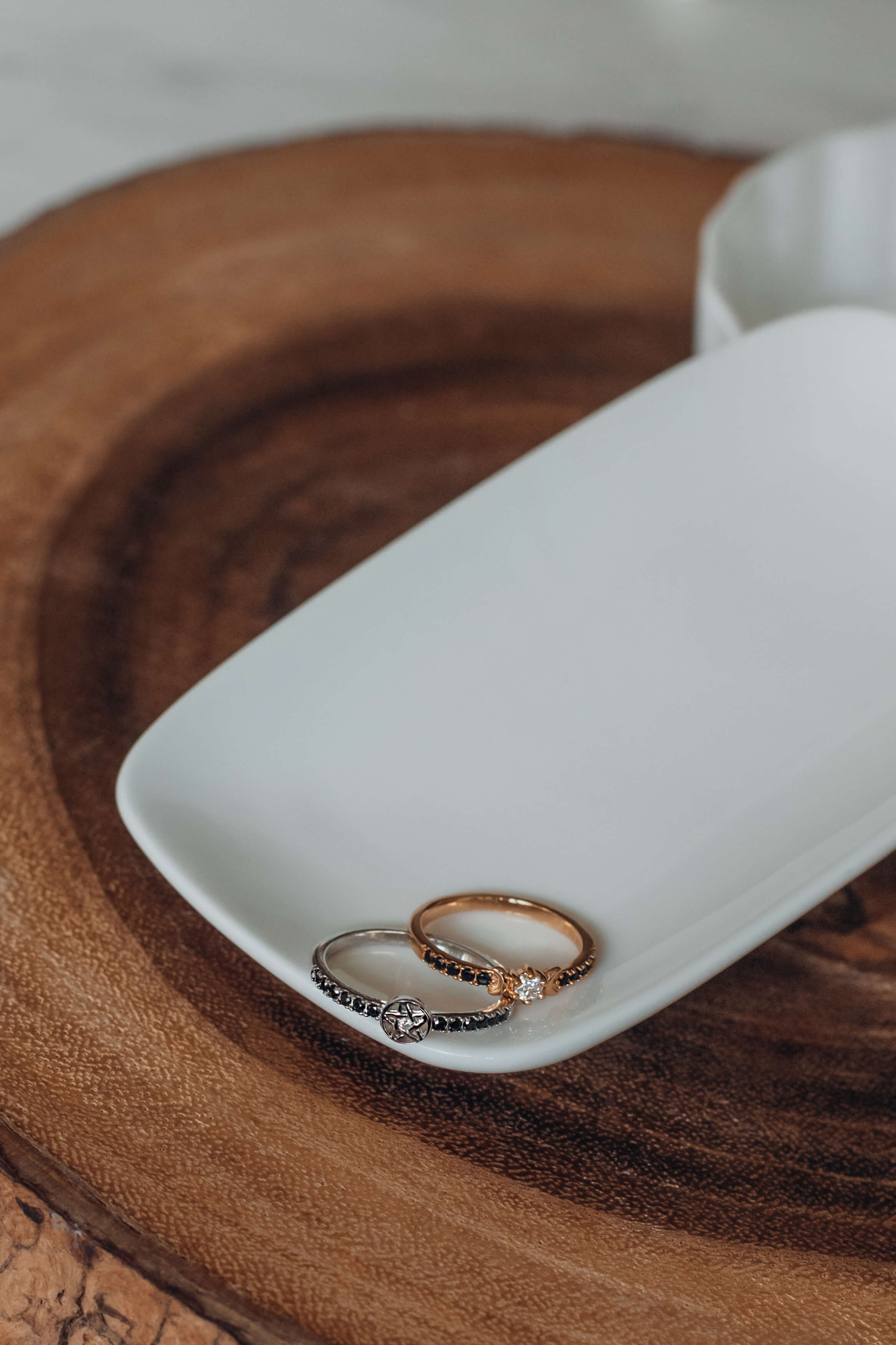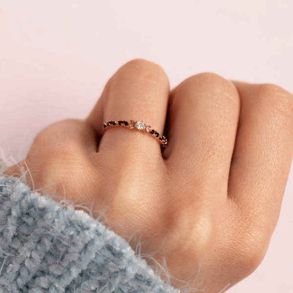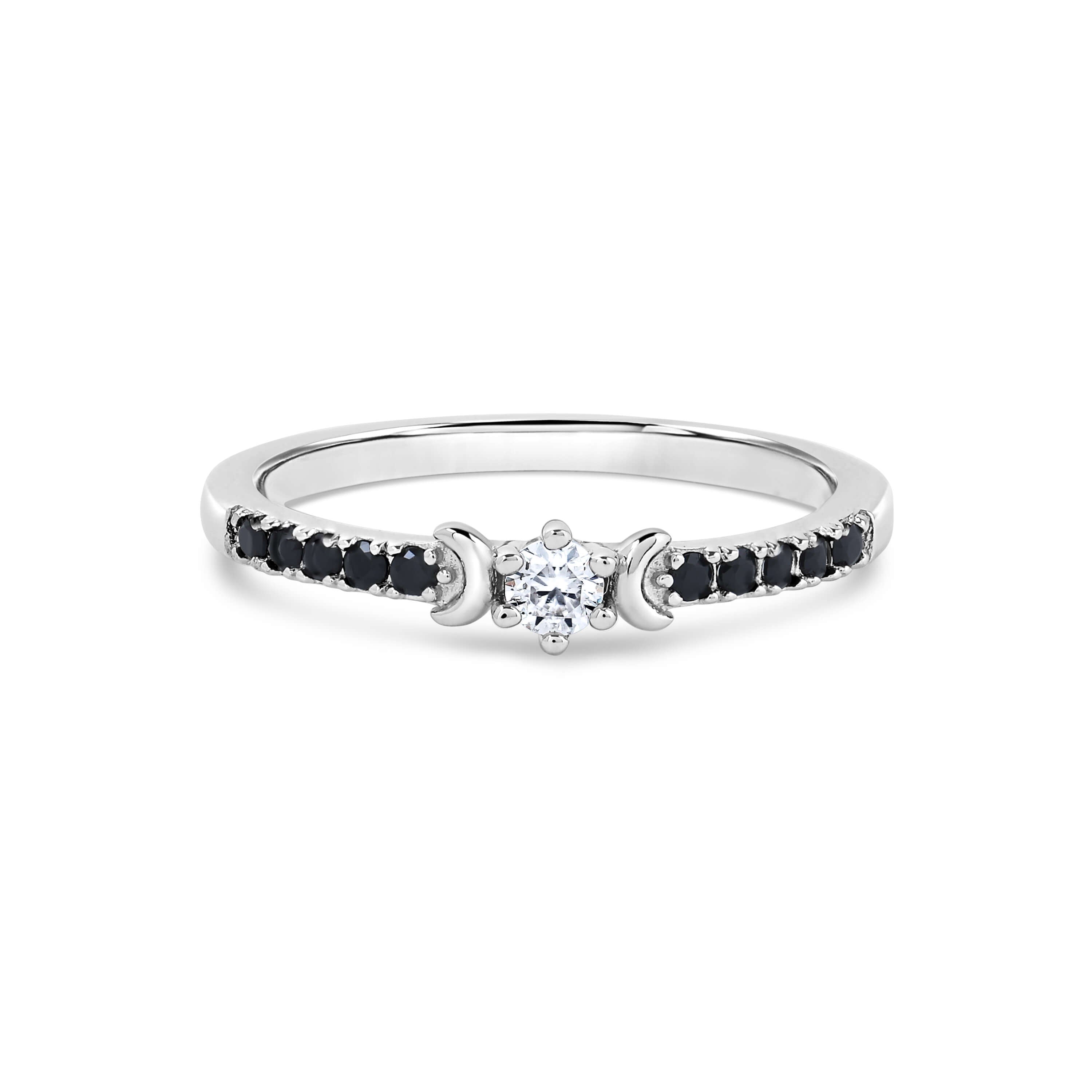 Studded with black cubic zirconia stones & a white moissanite stone.