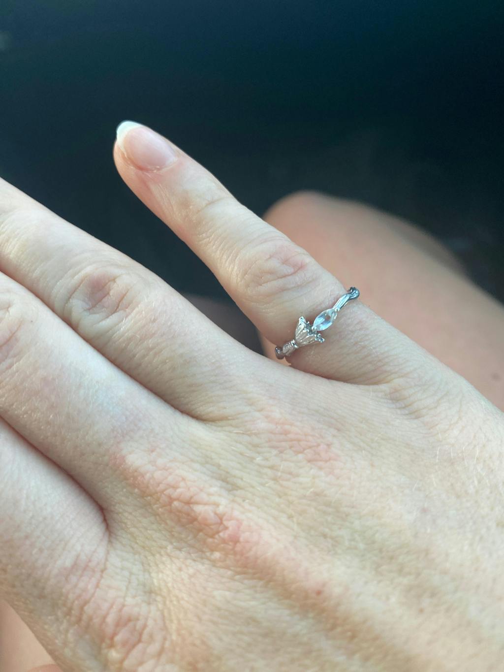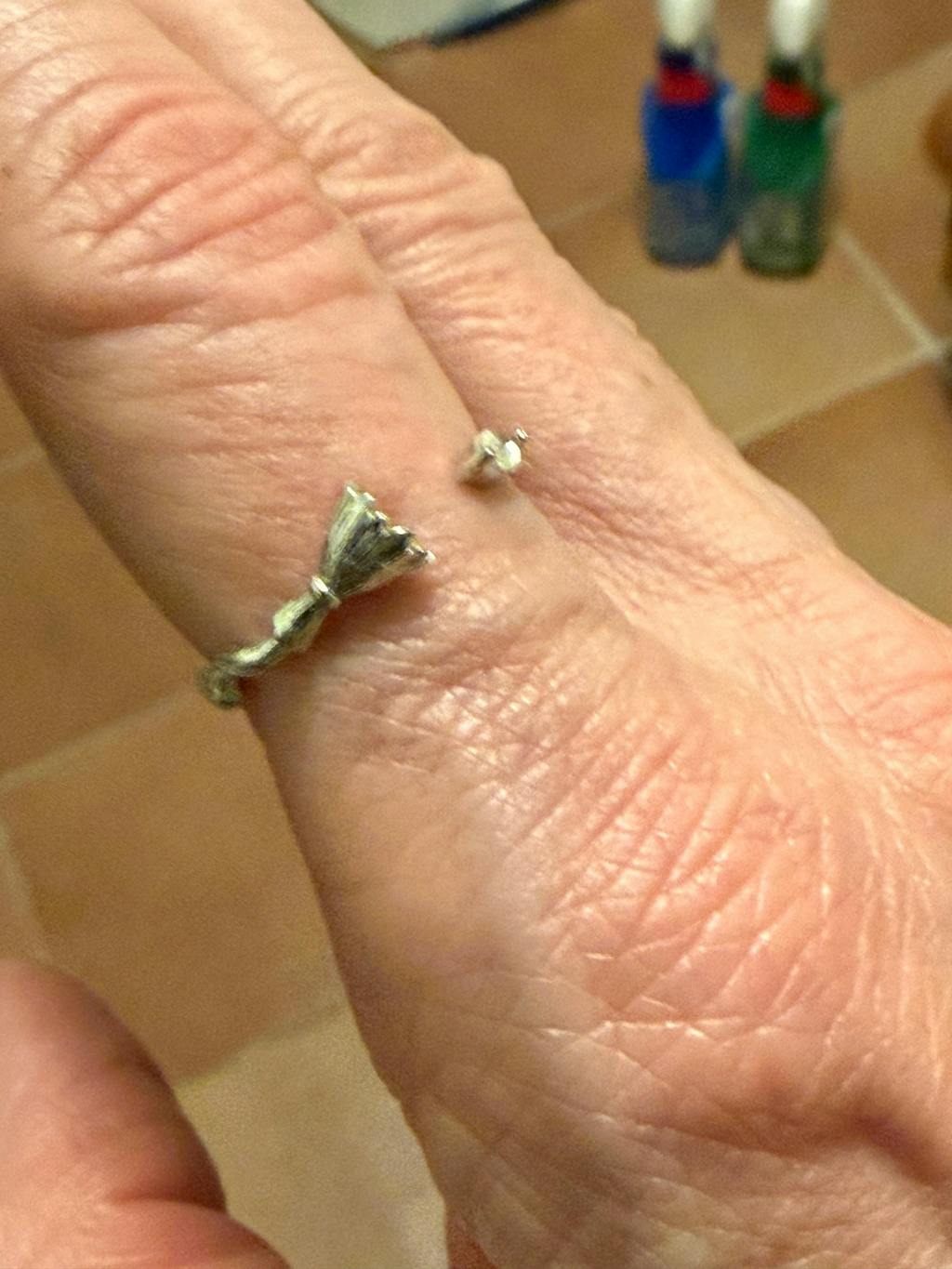 This ring is so delicate and beautiful. The small gem on the end of the broomstick is understated and lovely. I have never worn rings other than my wedding and engagement rings. I wear this everyday.