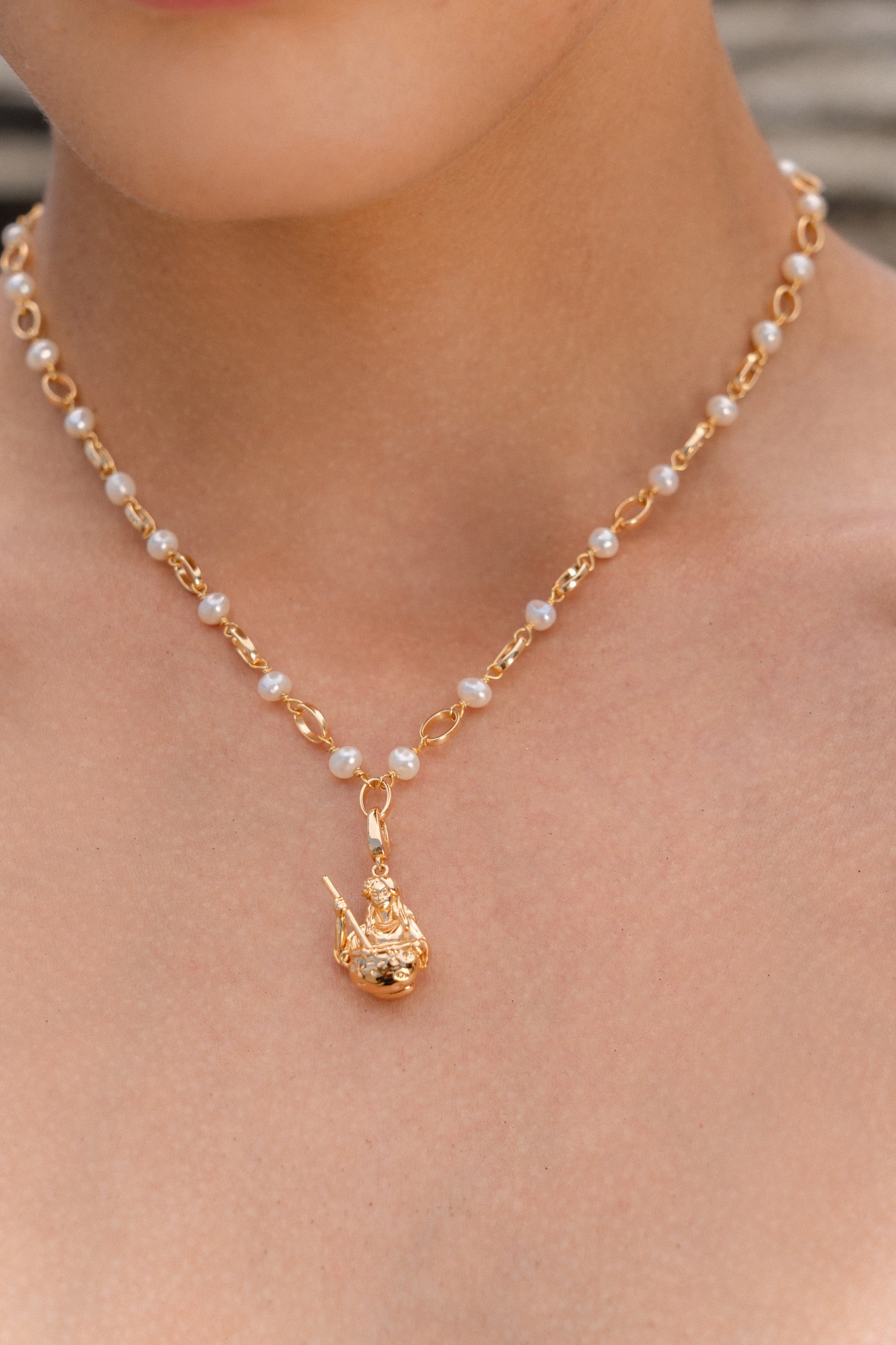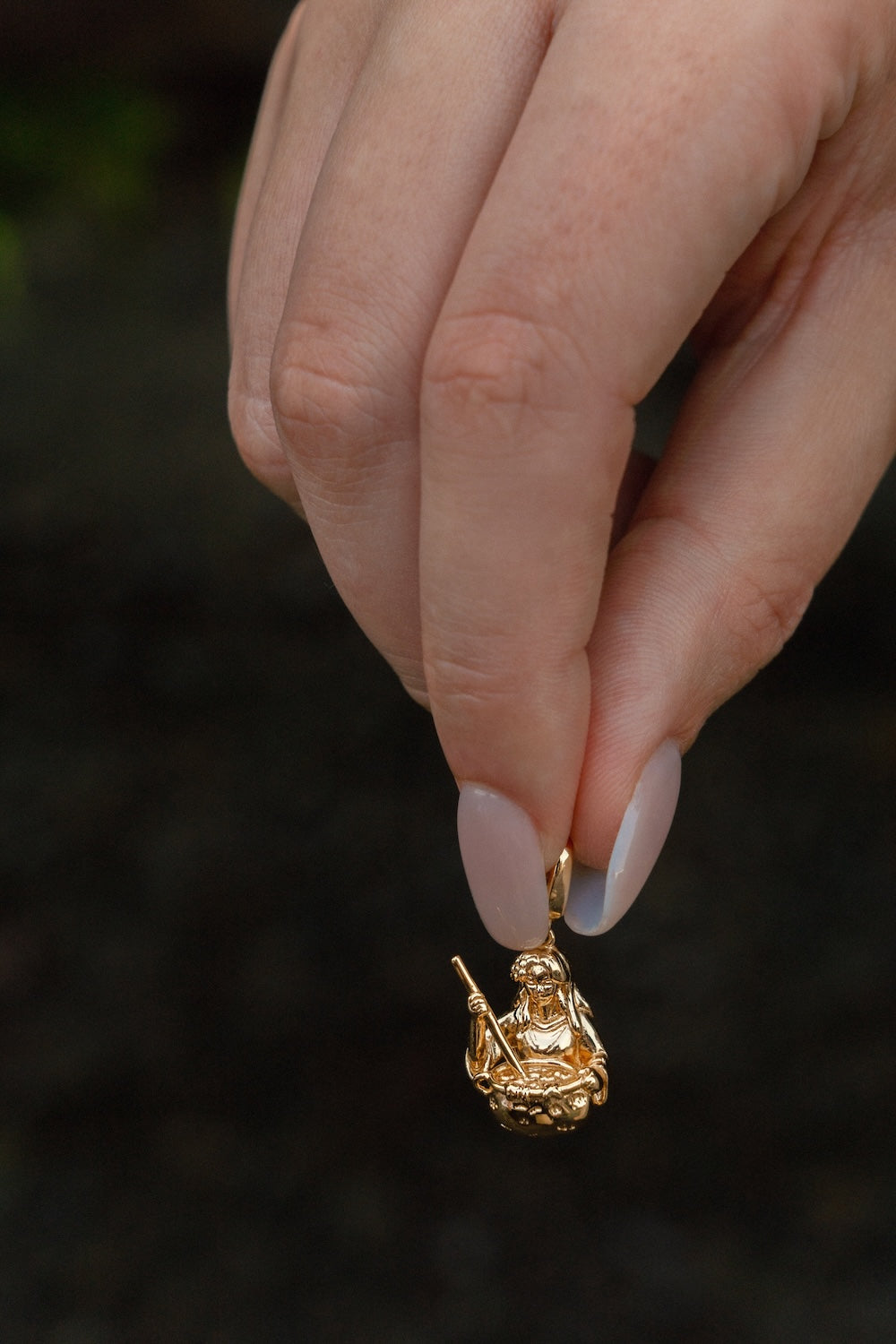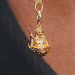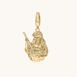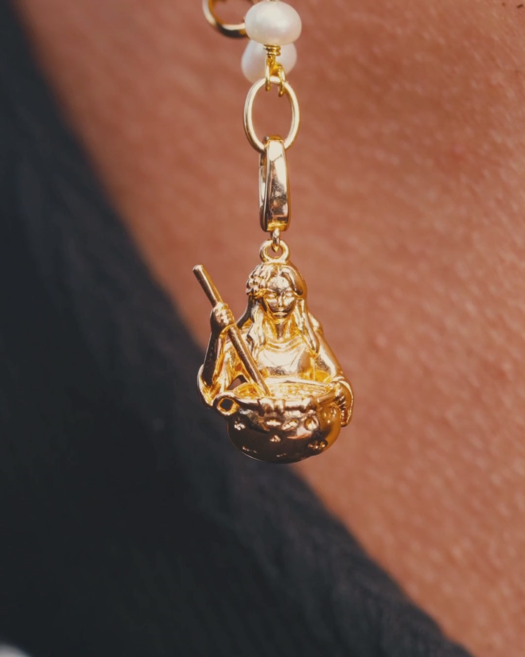 This charm depicts her in the act of creation, stirring her cauldron with serene focus, rendered in smooth, flowing silver or gold with beautifully carved details.