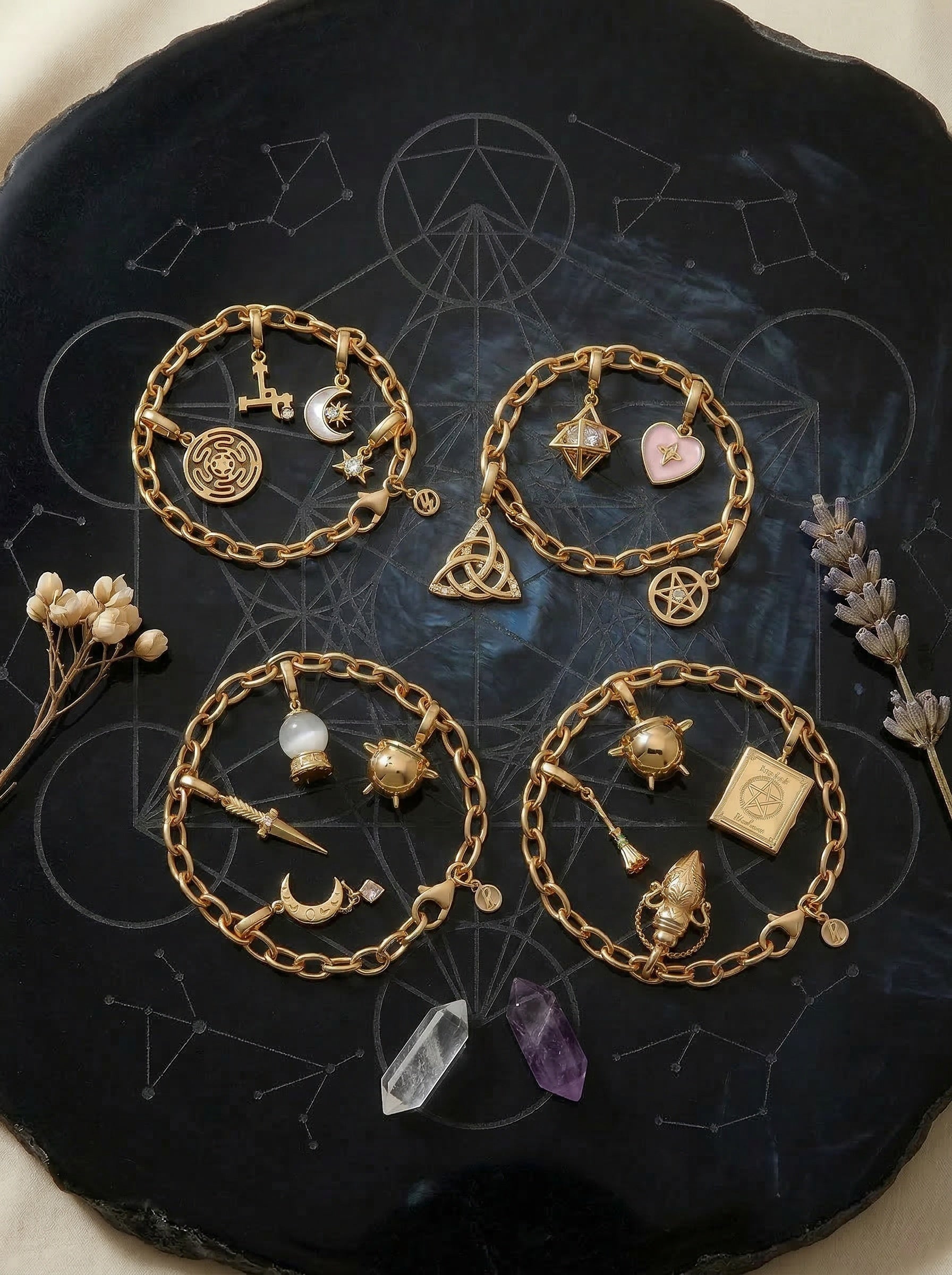 5 piece set containing: Oval link charm bracelet, Hecate's Wheel charm, Lilith Charm, Selene Charm and Triple Goddess Charm.