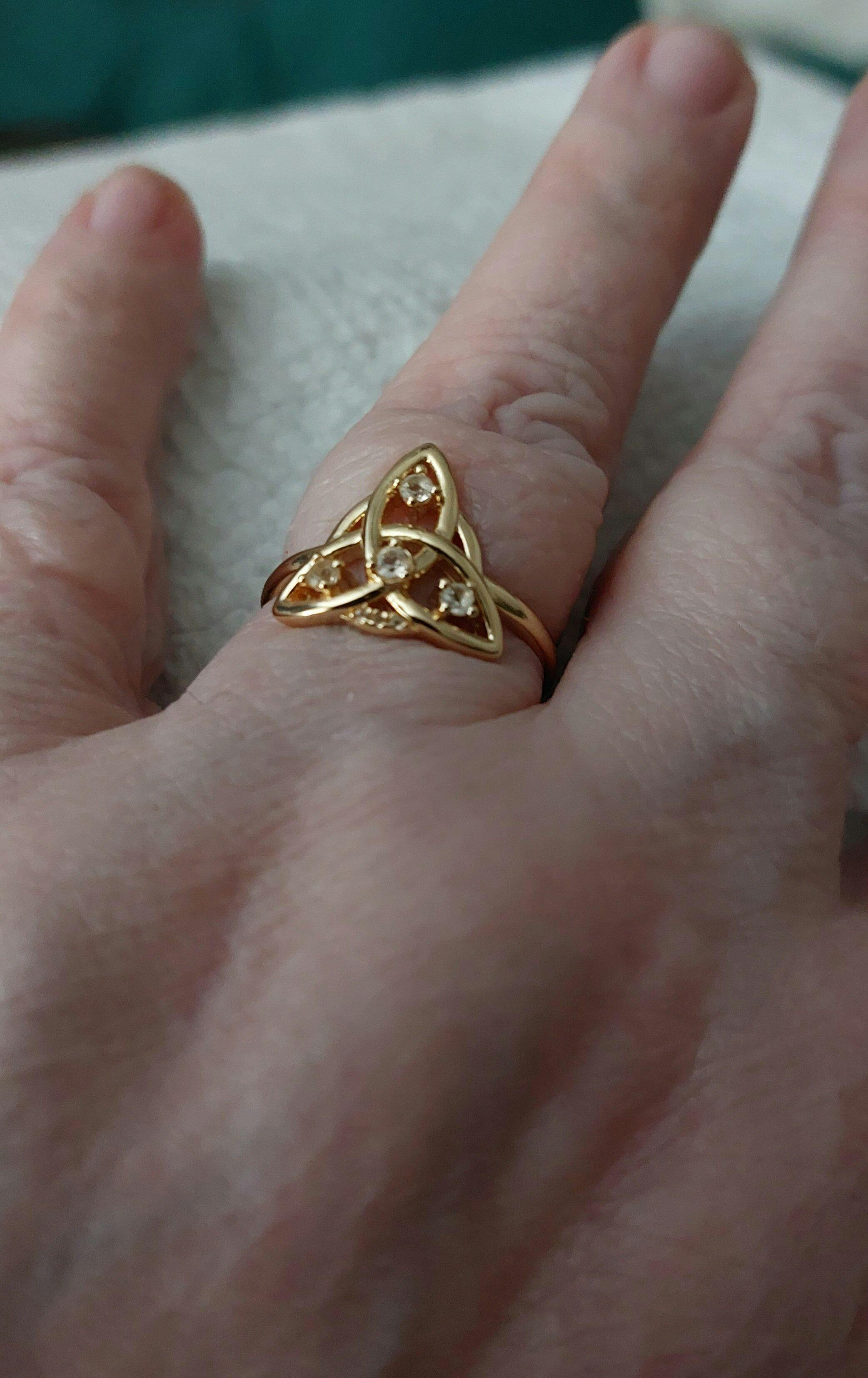 I absolutely love the triquetra ring. I chose the rose gold option, and it does not disappoint. The gems throughout the ring just make it even more beautiful. I'll definitely be back to order more items.